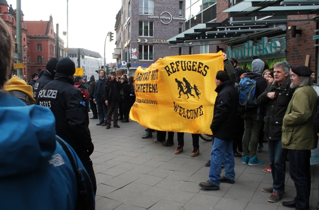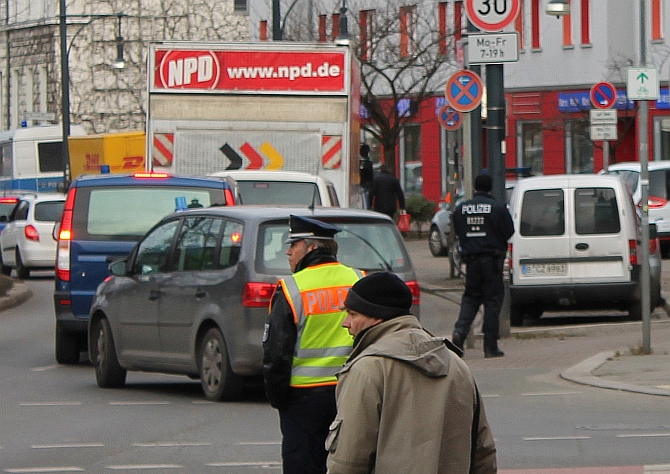 Die zwanzig Teilnehmer, die sie für ihre Kundgebung gegen Flüchtlinge und alles andere “Nichtdeutsche” (Slogan: “Für ein deutsches Deutschland”) angemeldet hatte, brachte die NPD nicht ganz zusammen. Dafür begann die Beschallung der Kreuzung Mühlenstraße/ Ecke Breite Straße etwas früher als angekündigt. Die allerdings wurde in der ersten halben Stunde des Aufzuges immer wieder unterbrochen – Lautsprechertechnik und Nazis lagen das eine ums andere Mal miteinander im Clinch.
