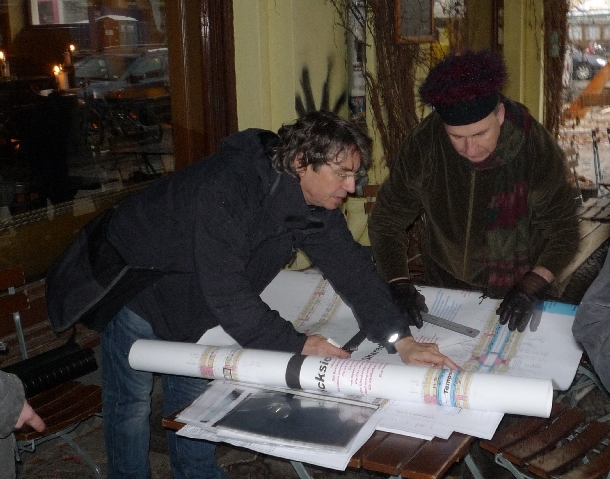 Weil „ein Plan auf einem Stück Papier die eine Sache ist und der Originalstraßenraum eine andere“ (Kirchner), sollte nun am Platze des künftigen Geschehens die Planung des Bezirksamtes in natura in Augenschein genommen und mit den Gegenentwürfen abgeglichen werden.
