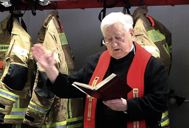 Da ja “Einweihung” auch etwas mit Weihe zu tun hat, hatten die Feuerwehrleute Pater Vincens gebeten, dem sanierten Haus seinen Segen zu geben.