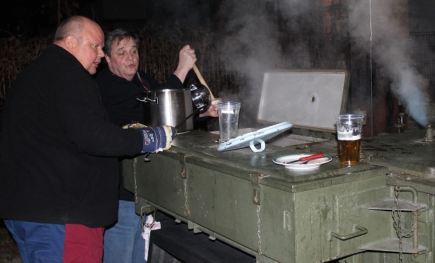 Die Zeit wurde unter anderem dazu genutzt, einem erst kürzlich aus Belgien zugezogenen Neu-Kameraden zu erklären, was Eisbein eigentlich ist – worauf sich unter den Umstehenden sofort eine Diskussion über die beste Zubereitungsart entspann: Das Sauerkraut mit in den Eisbeintopf geben oder doch separat zubereiten…