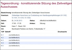 Jene Tagesordnungen, die der Prenzlberger Stimme mittlerweile dennoch vorliegen (siehe Download unten) lassen jedenfalls keinen Grund zur Geheimhaltung erkennen. Die nichtöffentlich behandelten Punkte lauteten regelmäßig „Protokollkontrolle“, „Verständigung zu Akteneinsicht und Öffentlichkeit der Ausschusssitzungen“, „Vorschläge für die nächsten Tagesordnungen des Ausschusses“ und „Sonstiges“