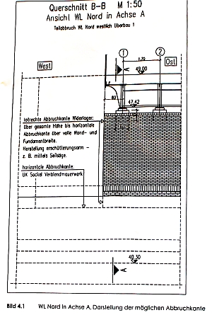 Offenbar sind die Planungen für den Abriss nicht ganz neu, denn imm Gutachten ist davon die Rede, dass ursprünglich ein Schrägschnitt durch das Bauwerk vorgesehen war. Nun aber wird empfohlen, “einen einfacheren senkrechten Schnitt durch das Widerlager zu führen.”
