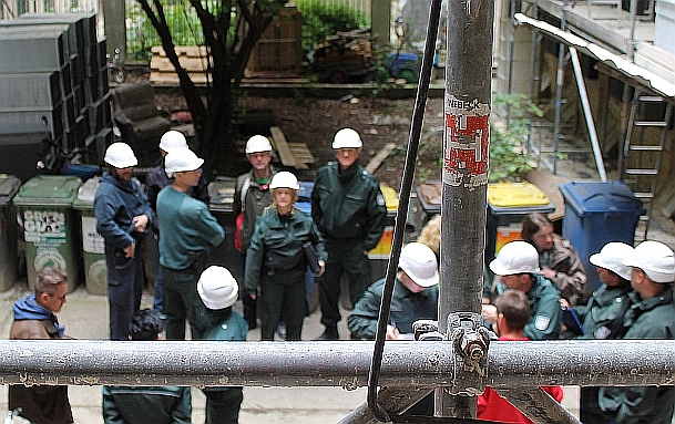 Ein Trupp bulgarisch sprechender Abrissarbeiter, dessen Mitglieder praktischerweise auch gleich in den leerstehenden Wohnungen nächtigten, schmiss dabei ungesichert Bretter und anderes Material vom Dach und den Gerüsten in den Hof. Hätte sich zum Zeitpunkt der Abwürfe ein Mieter auf dem Weg zur Mülltonne befunden – es wäre eine weitere Wohnung frei geworden… (siehe Video links)