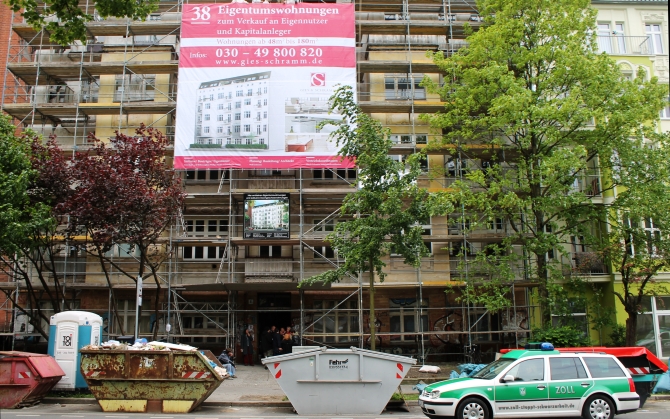 Gerüste wurden aufgestellt, Briefe trudelten bei den Mietern ein, in denen sie vor die Wahl gestellt wurden entweder gegen ein Entgelt auszuziehen oder aber eine Modernisierungvereinbarung mit erheblich höheren Mieten zu unterzeichnen. Der Witz dabei, so eine Mieterin – Klupp hatte keine – rechtlich vorgeschrieben – Modernisierungsankündigung verschickt. Lediglich den Anbau von Balkonen kündigte er an. Seine Firma berief sich ansonsten auf die Modernisierungsankündigung des Voreigentümers, deren Fristen längst abgelaufen waren.