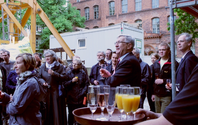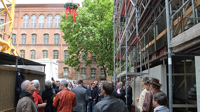 Das gesamte Bezirksamt war versammelt, als am Freitag im Hof der Heinrich-Roller-Grundschule die Richtkrone über das Betonskelett der neuen Sportalle schwebte.