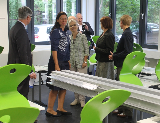 Schulleiterin Petra Burkert schien immer noch ein wenig erstaunt, wie schnell das alles ging. “Im März vergangenen Jahres waren Leute von der Senatsverwaltung hier und hatten schon mal sondiert, ohne aber eine verbindliche Zusage zu machen”. Die sei dann im Herbst 2013 erfolgt. Ab Januar wurde gebaut: Nach nur sieben Monate ist das Gebäude mit zwölf Unterrichts- und Aufenthaltsräumen nun bezugsfertig. Inclusive Möblierung Aufzug, und Behinder-