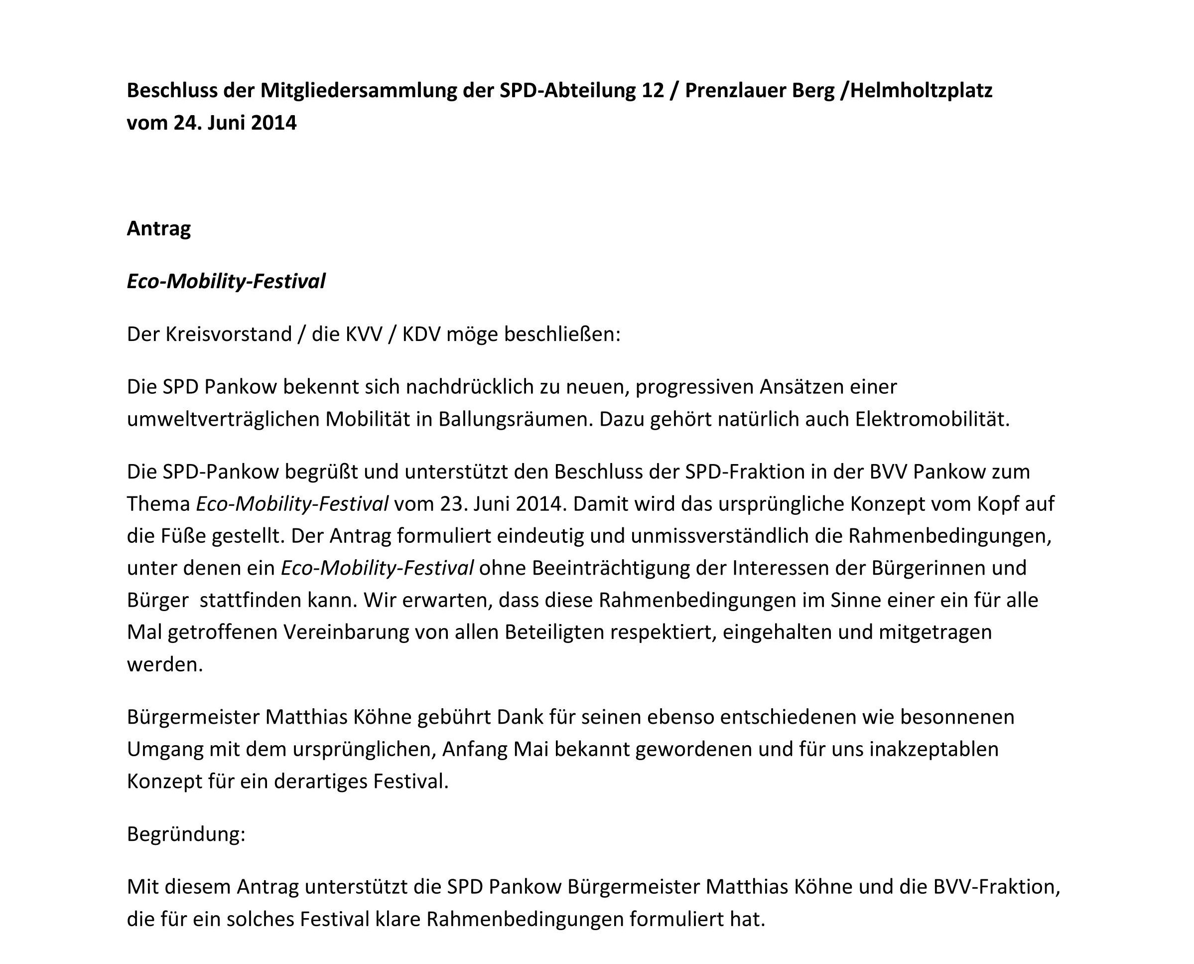 Denn den bündnisgrünen Partnern der Pankower Sozialdemokraten, die das Elektromobil-Fest unbedingt im Bezirk haben wollten, schwante wohl nicht ganz zu unrecht, dass eine zustimmende „Zweidrittelmehrheit der Anwohner“ – wie immer man die auch ermitteln wollte – wohl schwerlich zu erreichen war. Und also formulierten sie einen eigenen Antragsentwurf und übergaben diesen der sozialdemokratischen Fraktionsspitze – dem Vernehmen nach nicht ohne auf die Verpflichtngen zu verweisen, die sich für die SPD aus der rotgrünen Zählgemeinschaft ergäben…