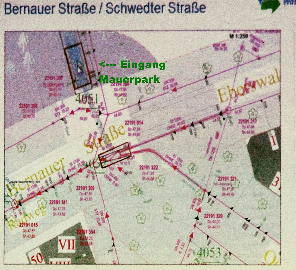wasserkanals trotz des unterirdischen Vortriebs enorme Einschränkungen. So wird wohl die Bernauer/Eberswalder Straße gesperrt und der Straßenbahnverkehr unterbrochen werden müssen, weil unmittelbar im Eingangsbereich des Mauerparks nicht nur der “Einstieg” des Schildvortriebes befinden wird, sondern auch Rohrablageplätze, Kran und Bauarbeiterstützpunkte ihren Platz haben sollen (siehe Grafik links).