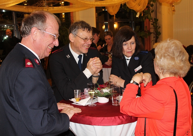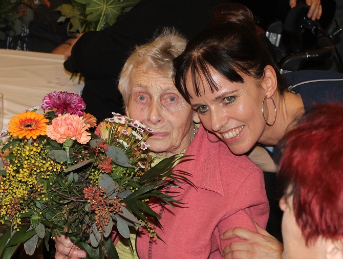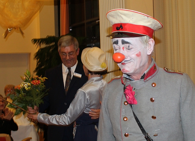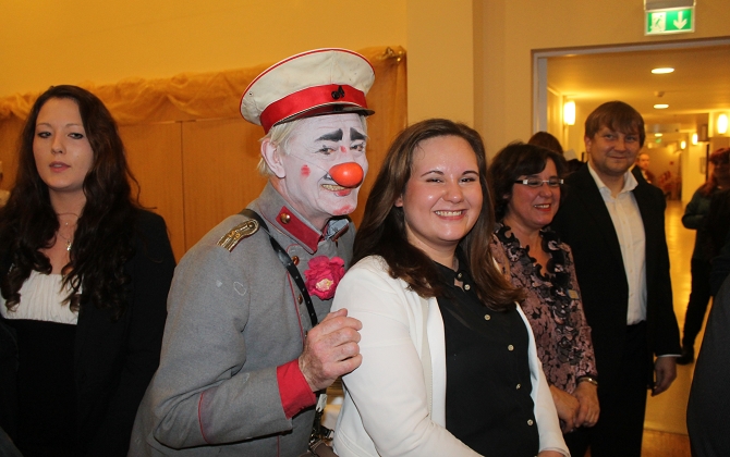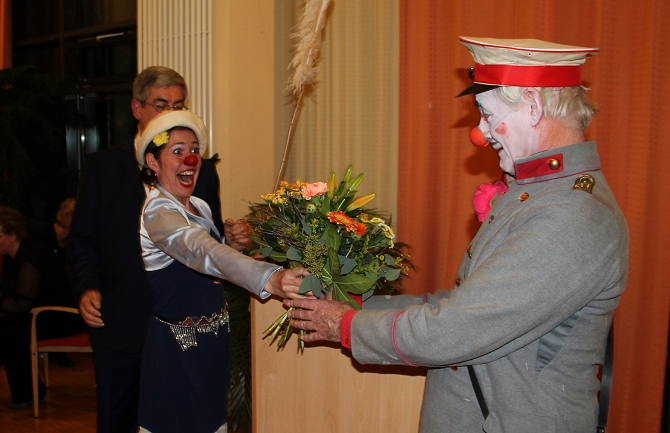 Seit über zehn Jahren ist die Clownsgruppe „Die roten Nasen“ bei der Unterhaltung vor allem demenzkranker Bewohner in den Häusern der Stiftung aktiv. Die Spaßmachertruppe hatte zwar neben zwei Schauspielerinnen auch einen Herren zum Neujahrsempfang entsandt, aber von Wilfried Brexel inniglich geherzt wurde… – genau!