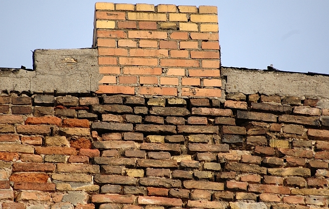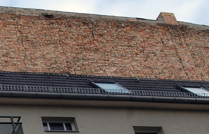 Eine nackte Ziegelwand ragt über das anliegende Nachbar-