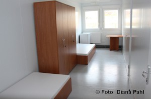 In den drei baugleichen Gebäuden stehen für jeweils zwei Personen 15 Quadratmeter kleine Zimmer zur Verfügung. Familien werden in zwei solchen Zimmern untergebracht, die jeweils mit einer Verbindungstür verbunden sind. In jedem der drei Gebäude befindet sich jeweils behindertengerechter Wohn- und Schlafraum.