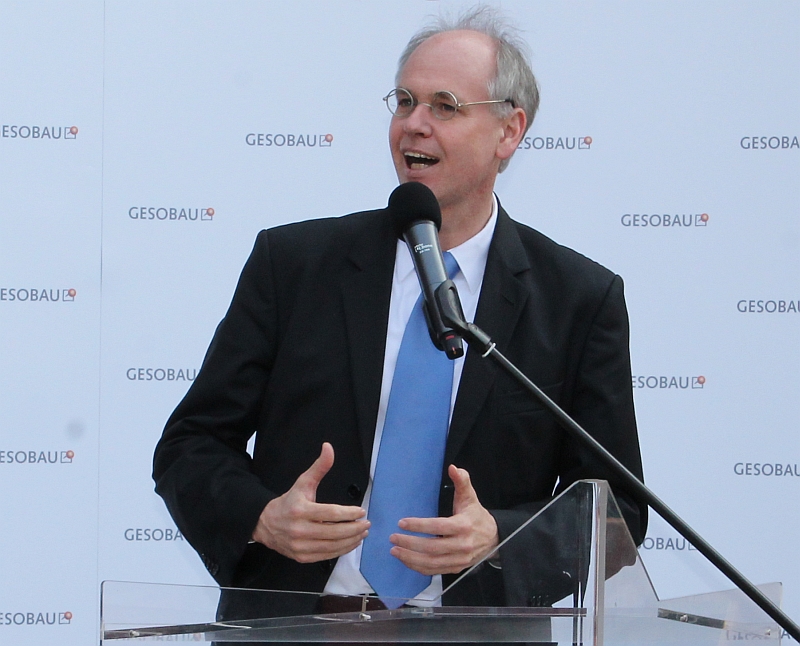 Nachdem der Rohbau jene akustische Statikprüfung ohne sichtbare Schäden überstanden hatte, nahm GESOBAU-Vorstand Jörg Franzen die verfehlte Wohnungspolitik der Vergangenheit aufs Korn. Er tat das nicht direkt, sondern for-