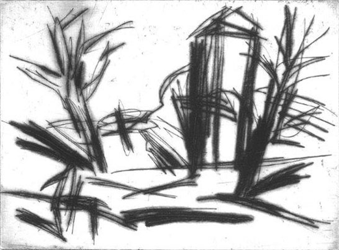 Abbildung oben: Jürgen Gerhard, „Bei Ahrenshoop“, 1986, Kaltnadelradierung (auf Ekalon), 11 x 15 cm