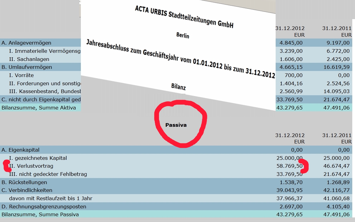 Seit Gründung der „Prenzlauer Berg Nachrichten“ befindet sich die das Projekt tragende GmbH in den Roten Zahlen. Und das nicht nur gleichbleibend, sondern galoppeiernd. Dies ist mit zwei Klicks im Bundesanzeiger, in dem die jährlichen Bilanzen veröffentlicht werden, nachzulesen. Die letzte veröffentlichte Bilanz (für das Jahr 2013) wies ein Minus von über 82.000 Euro aus. Mttlerweile dürften es um die 100.000 sein – und das bei einem Haftungskapital von nur 25.000 Euro.