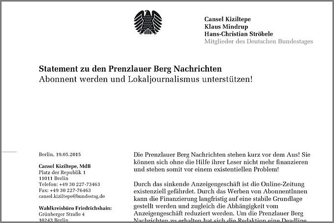 Ein Anruf in Ströbeles Bundestagsbüro brachte zwar die Bestätigung, dass der Name des Politkers mit dessen Wissen auf den Reklamezettel gesetzt wurde, doch auf den Hinweis, dass es sich bei den „Prenzlauer Berg Nachrichten“ um ein kommerzielles, auf Gewinn ausgerichtetes Unternehmen handelt, hält bei dem am Telefon befindlichen Mitarbeiter Ströbeles das große Staunen einzug: „Ich dachte, das wäre eine nichtkommerzielle Angelegenheit.“