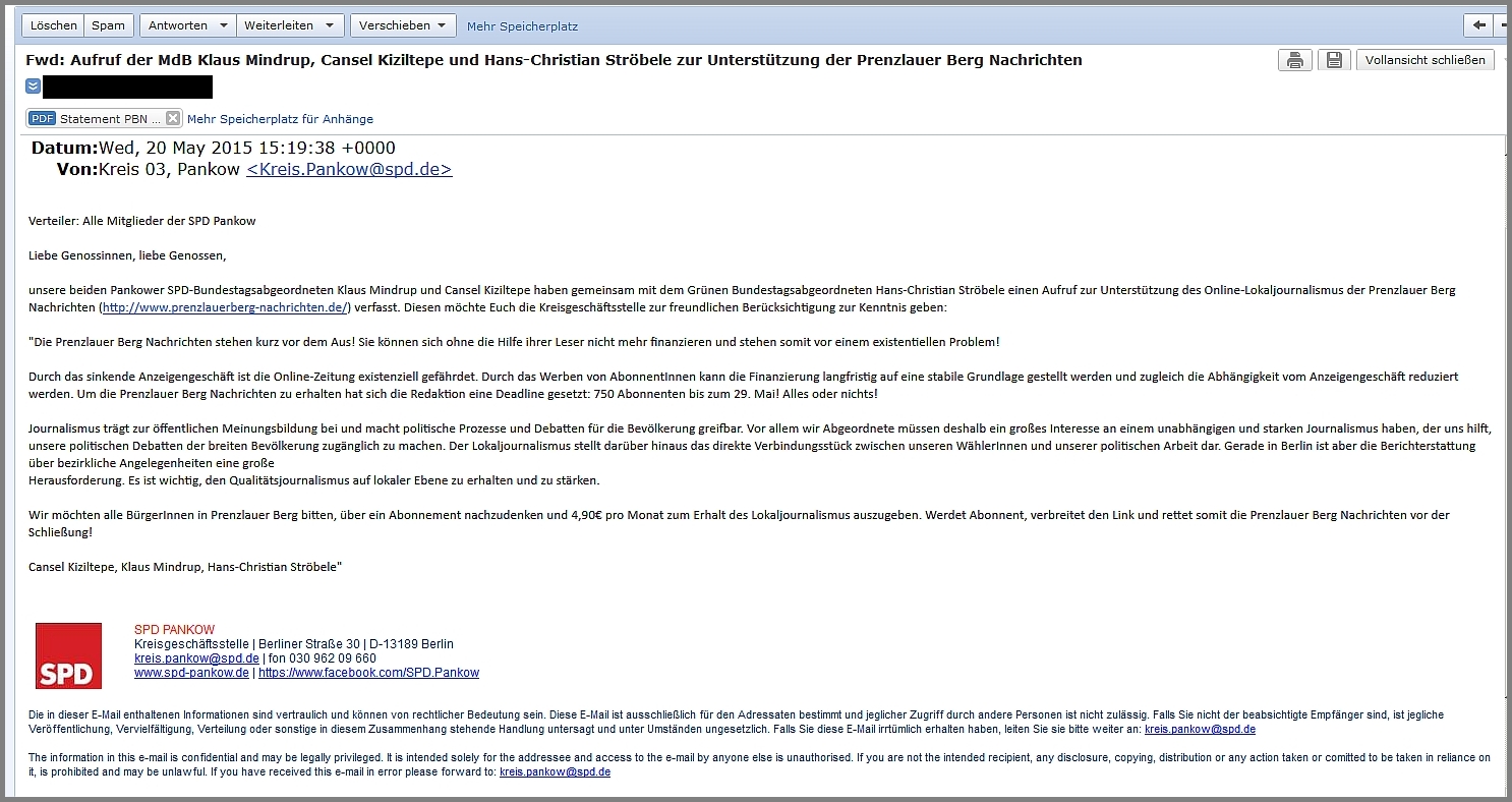 Die Kreisgeschäftsstelle der SPD Pankow hat in der vergangenen Woche über 1.000 E-Mails mit einer Werbebotschaft zugunsten der Acta Urbis Stadtteilzeitungen GmbH ihres Genossen Philipp Schwörbel versandt. In der Mail wurde auf die Aktion der SPD-Bundestagsabgeordneten Klaus Mindrup und Cansel Kiziltepe sowie des bündnisgrünen Abgeordneten Hans-Christian Ströbele verwiesen, die zum Kauf von Abonnements des Kiezblogs des SPD-Mannes Schwörbel aufgerufen hatten.