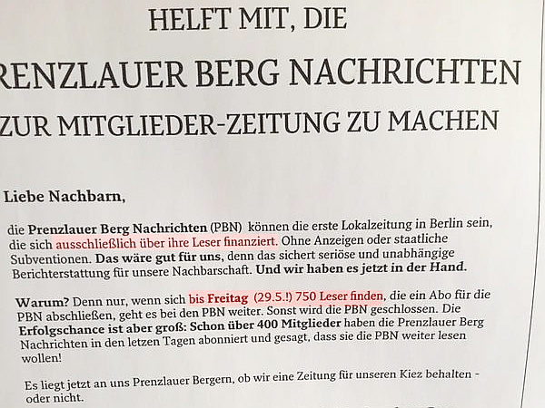 Zwischen Ende April und Ende Mai wollte das Kiezblog „Prenzlauer Berg Nachrichten“ (PBN) des Pankower Sozialdemokraten Philipp Schwörbel in einer deutschlandweiten Kampagne mindestens 750 zahlende „Mitglieder“ werben. Sollte die „Mitglieder“-Zahl nicht erreicht werden – so hieß es auf der Schwörbel-Seite – werde die Arbeit an dem Blog eingestellt.