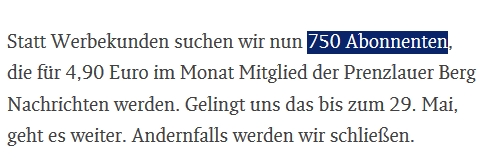 Denn auf der Kampagne-Seite der PBN stand mitnichten etwas von „Paketen“ – stets war von Abonnenten, von 750 Abonnenten die Rede. Und immer wieder las man, dass sich der Kiezblog ausschließlich durch seine Leser finanzieren soll.