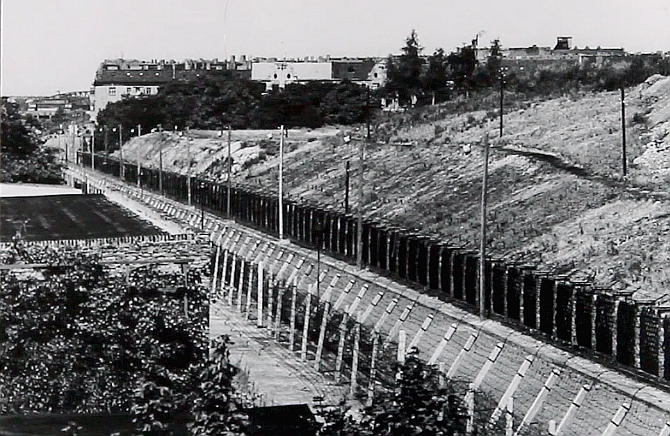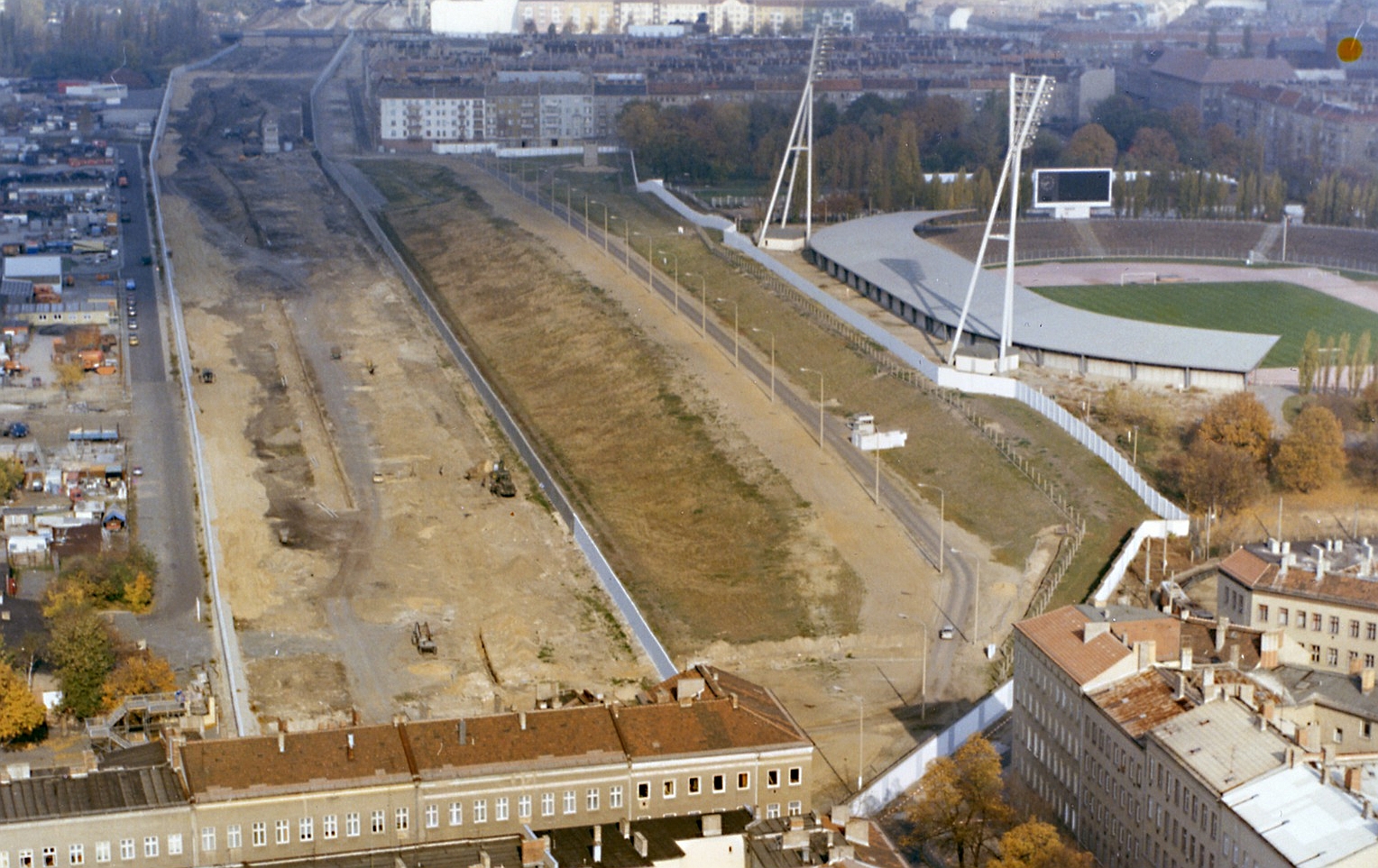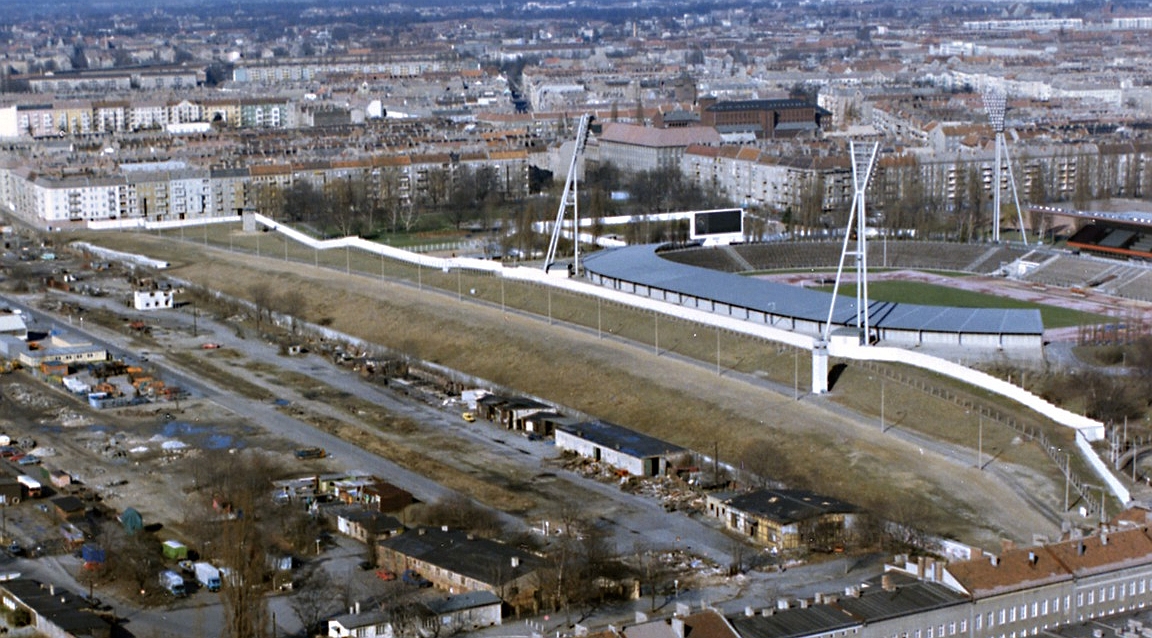 Das Stadionrund liegt auf einer Anhöhe, gleich dahinter ein Abhang, der kurz vor der Schwedter Straße endet. Die Straße selbst war die Grenze. So hatte die Stadionmauer nicht nur den Zweck, unerwünschte Ost-West-Wanderungen zu verhindern, sondern auch den Blick auf den im „Tal“ liegenden Wedding zu versperren.