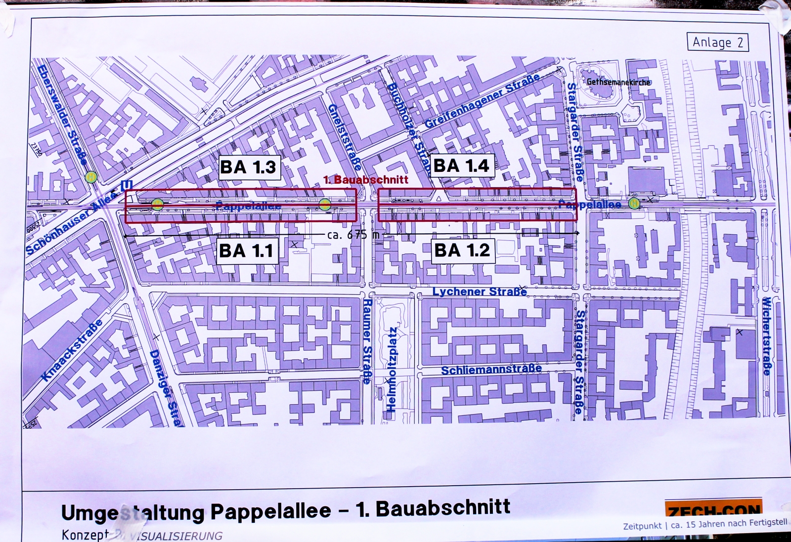 Der erste Bauabschnitt zwischen der der Danziger und der Stargarder Straße wird in vier Teilabschnitte unterteilt (siehe Bild unten), die nacheinander umgebaut werden. Für jeden Teilabschnitt ist ein halbes Jahr Bauzeit geplant. Begonnen wird auf der östlichen Straßenseite.
