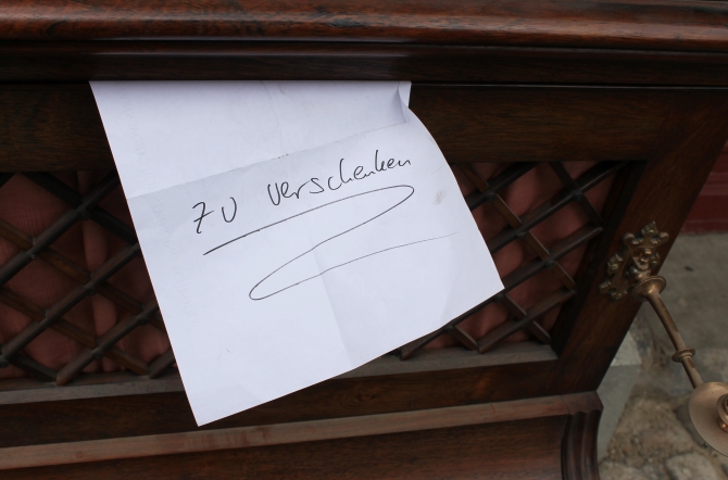Deshalb werden neue Exponate auch grundsätzlich nur im Schutze der nächtlichen Dunkelheit im öffentlichen Ausstellungsraum aufgestellt. Die großherzigen Geber möchten niemanden beschämen und daher unerkannt bleiben.Sicher gibt es auch in diesem Fall den einen oder anderen Querulanten, der das nachbarschaftliche Engagement in Misskredit bringen möchte und daher nichts besseres zu tun hat, als die örtlichen Ordnungshüter auf die wohltätigen Möbelverteiler anzusetzen.