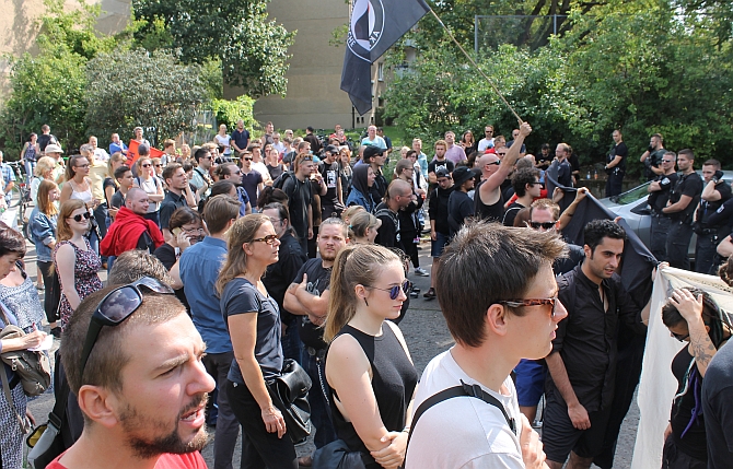 Über 100 Pankower protestierten am Sonnabend in der Pankower Wolfshagener Straße gegen eine ausländerfeindliche Kundgebung der NPD vor dem Freibad Pankow.