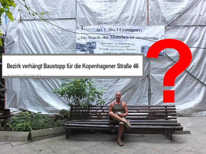 Am Donnerstag Abend hatte Stadtentwicklungsstadtrat Jens-Holger Kirchner vor Publikum verkündet, dass er am kommenden Tag einen Baustopp für das Skandalhaus Kopenhagener Straße 46 verfügen werde.