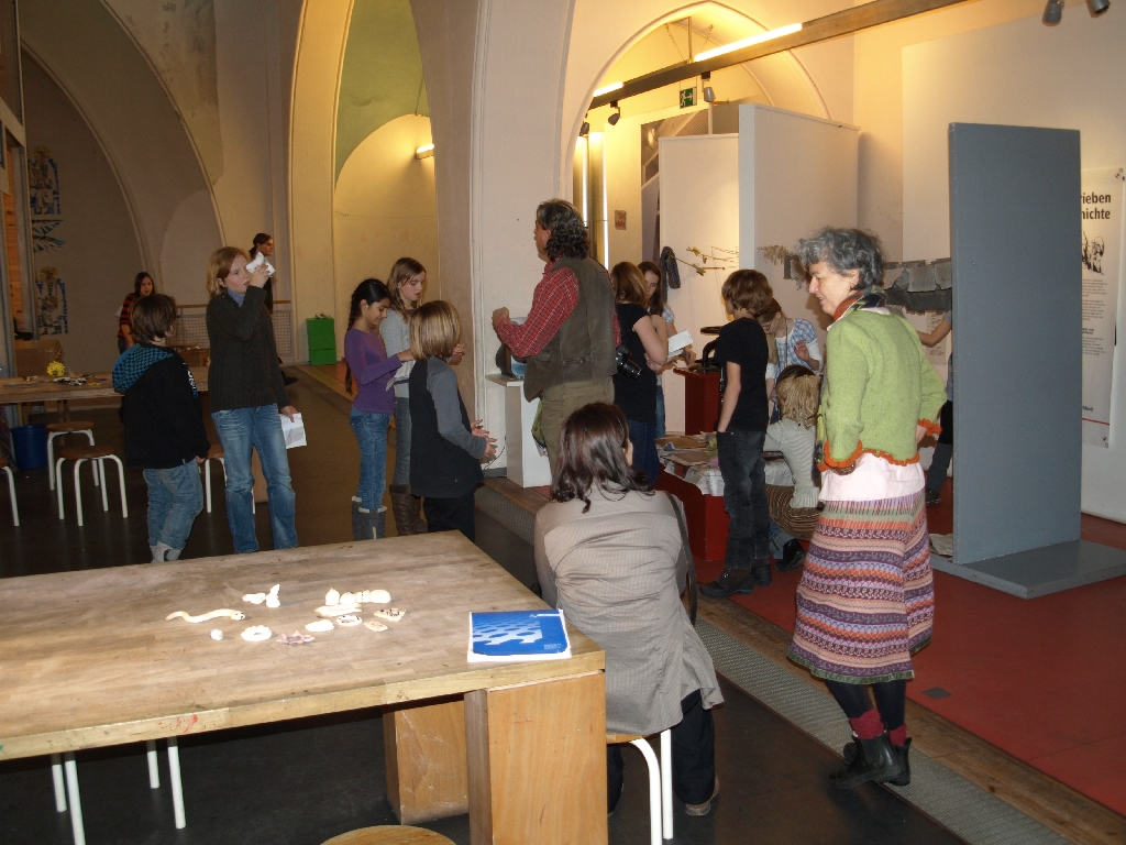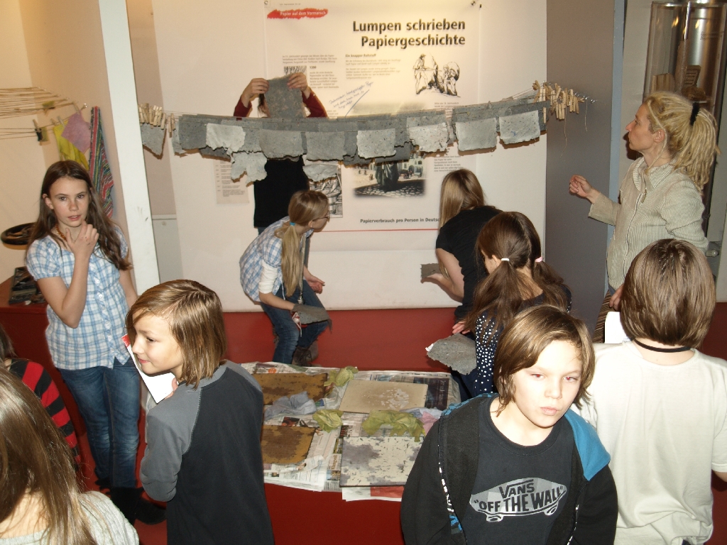 Wenn bei der gerade zu Ende gegangenen Ausstellung „Papier“ das Thema war, dann waren eben nicht nur Schautafeln und Ausstellungsstücke zu sehen, überall war die Möglichkeit gegeben, dass Gesehene anzufassen, auszuprobieren. Einen Bogen Papier herstellen? – Klar doch! Spannend, so eine Sache mal selbst zu machen – und dann noch in der Pampe manschen zu können… . Spielen und lernen mit allen Sinnen.