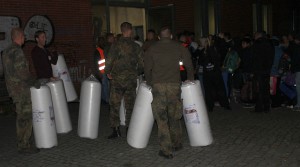 Also wird entschieden, erst einmal nur Matratzen in die Halle zu bringen. Die Soldaten bilden eine Kette vom Anhänger, auf dem die Matratzen angeliefert wurden, bis hinein in die Halle.