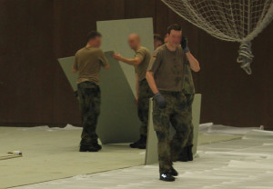 Gegen 21 Uhr trifft eine Gruppe Soldaten ein. Kurze Besichtigung, dann beginnen sie mit der Verlegung der Spanpressplatten.