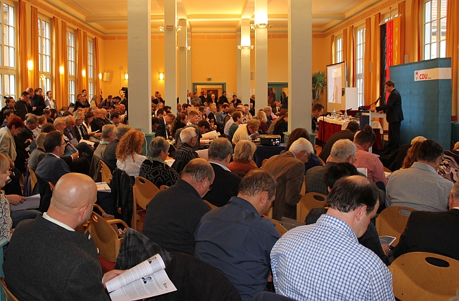Dass von den mehr als 900 CDU-Mitgliedern 270 den Weg zum Veranstaltungsort in der Schönholzer Heide fanden, überraschte offenbar selbst die Organisatoren: Im proppevollen Saal fehlte es schlicht an Stühlen, rund fünfzig Anwesende mussten dem Parteitag anfangs im Stehen verfolgen.