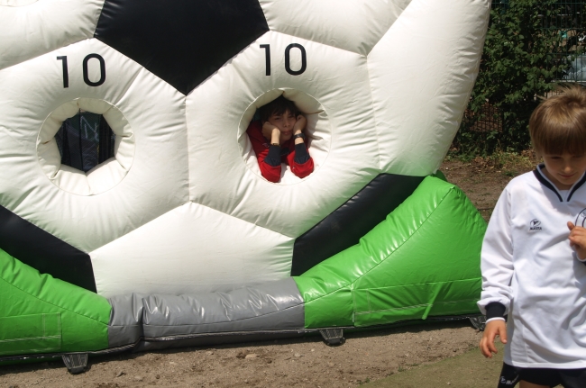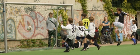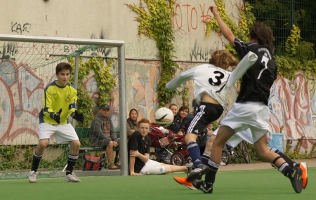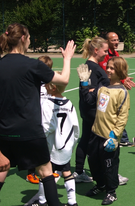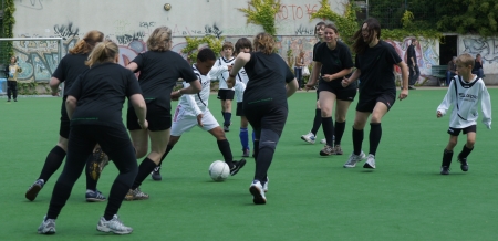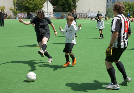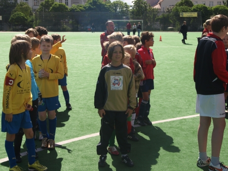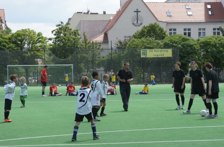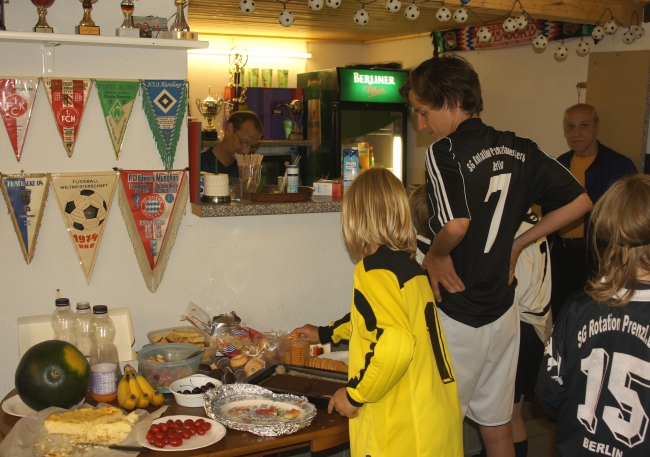 Das war’s nun endgültig: Mit einer großen Fußballparty auf dem Teschsportplatz feierte die Jugendabteilung von Rotation Prenzlauer Berg den Abschluss der Saison. Und wie feiern richtige Fußballspieler? Klar – mit ein paar tollen Spielen! Diesmal sollten es aber keine gleichaltrigen Gegner sein, die die Jungs schlagen wollten, sondern, sondern ältere. Gegen gegen die B-Junioren, die sieben bis acht Jahre älter sind. Und als würde das noch nicht reichen: Eine ganze Generation älter waren die Spieler…äh…Spielerinnen, die dann gegen die Jungs antraten.
