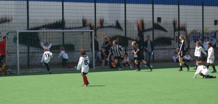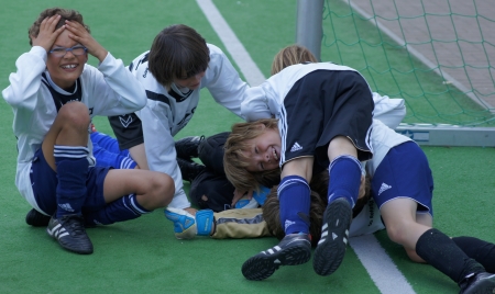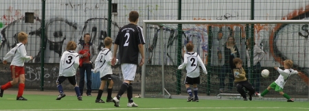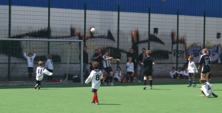 Dann war es aber soweit und die Jungs konnten auch endlich ran. Es wurden zum Schluss eine ganze Menge Spiele – schließlich spielte ja praktisch jeder gegen jeden. Hier beschränken wir uns mal nur auf zwei Begegnungen – schon deshalb, weil sie ganz souverän gewonnen wurden. Da wäre zum Beispiel das Match gegen die B-Junioren. Das sind die 15- bis 17jährigen – also fast schon „Alte Herren…“