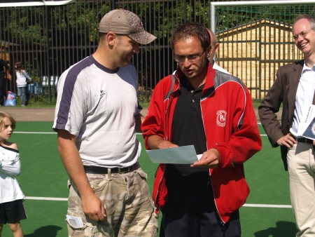 | Doch seltsam: Nur ein paar Minuten später – Sascha hatte gerade vergessen, welche Mannschaften nun spielen sollten und sich deshalb den Spickzettel von Axel Barski ausleihen müssen – da war der Schal von den Bürgermeisterschultern verschwunden. Aber das lag bestimmt nur an den sommerlichen Temperaturen… |  |