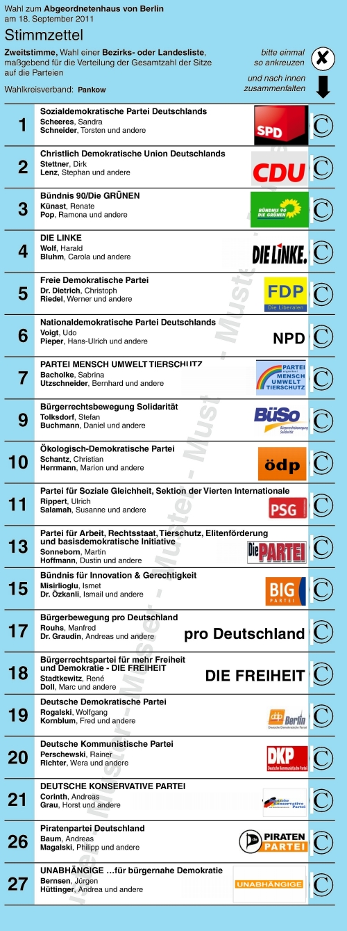 Neunzehn Parteien treten an, um Sitz und Stimme im Berliner Landesparlament zu erhalten. Nicht jeder wird alle kennen. Ein Klick auf das entsprechende Logo, das hier auf dem Stimmzettel-Nuster eingefügt wurde öffnet die Seite der jeweiligen Partei. So kann man sich über das Wahlprogramm und die Kandidaten der sich bewerbenden politischen vereinigungen informieren.