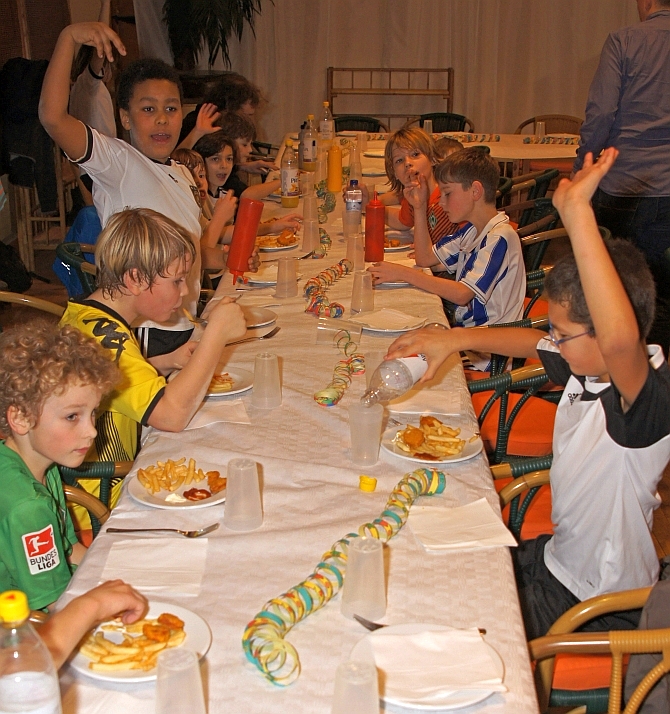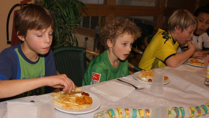 Außerdem gab es als Festtagsschmaus Pommes mit Mayo und Ketchup. Wer einmal gesehen hat, mit welcher Geschwindigkeit und Inbrunst Neunjährige verölte Kartoffelstreifen mit noch öligerer Mayonnaise oder mit Zucker und allerlei anderem verdünntem Tomatenmark in sich hineinstopfen…