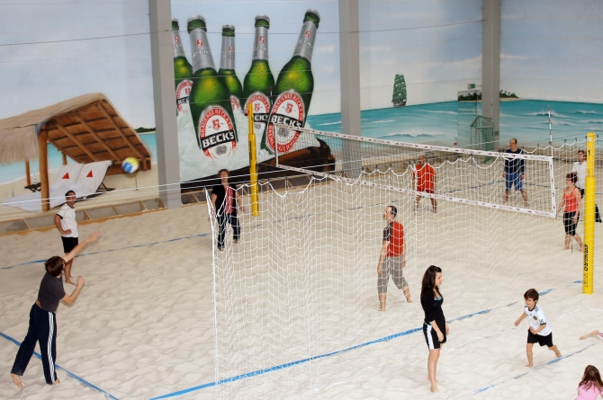 Und so hatten die Jungs der 2. E seinerzeit auf eine Weihnachtsfeier verzichtet und ließen sich dafür nun einen Neujahrsempfang ausrichten. Der fand zwar nicht direkt an den Playas del Este zwischen Santa Maria del Mar und Guanabo statt, aber der weiße Sand im „Indoor Beach Center“ im Märkischen Viertel sowie die dort im Hintergrund aufgemalten Palmen ließen zumindest eine Ahnung von der Isla Grande aufkommen.