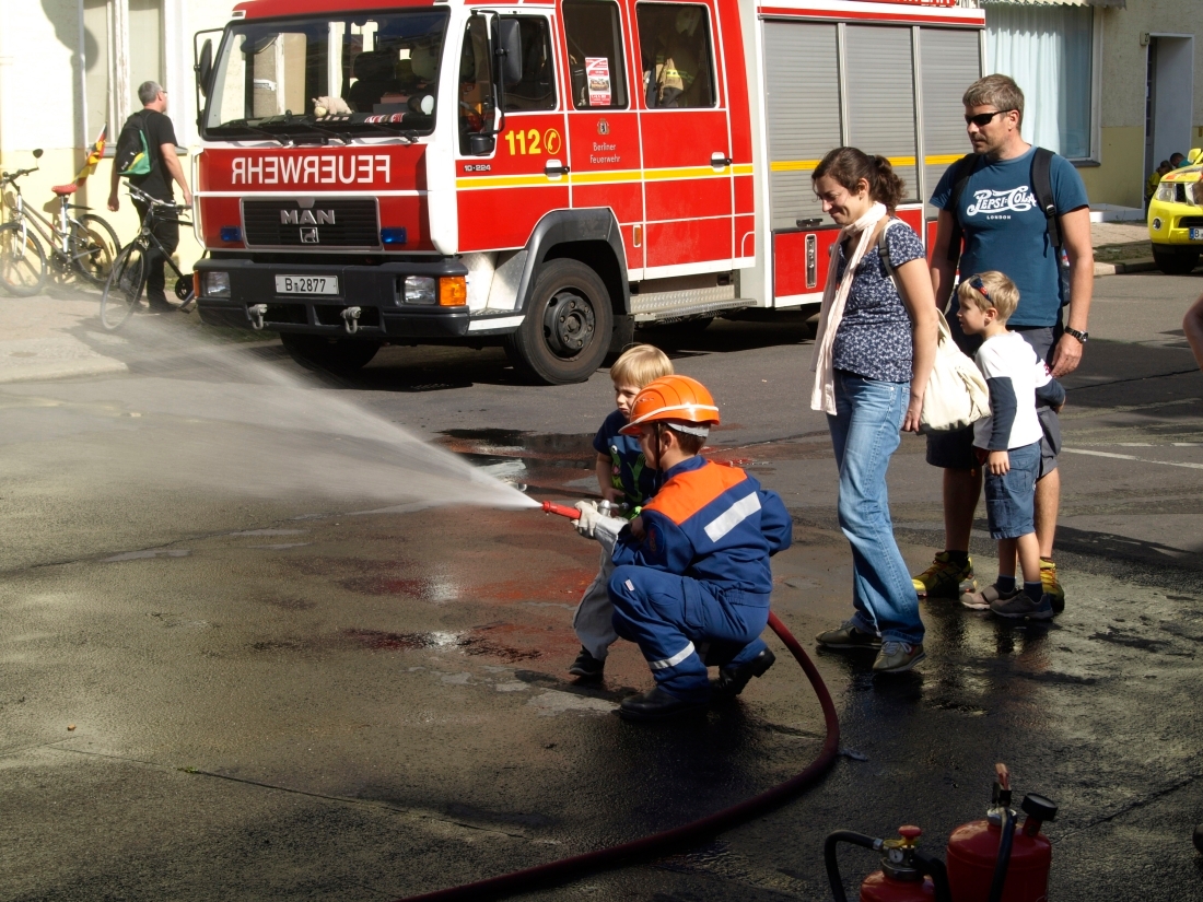 Die Vorführung eines Brandbekämpfungseinsatzes mit Personenrettung war der Höhepunkt des diesjährigen Tages der offenen Tür der Freiwilligen Feuerwehr Prenzlauer Berg.