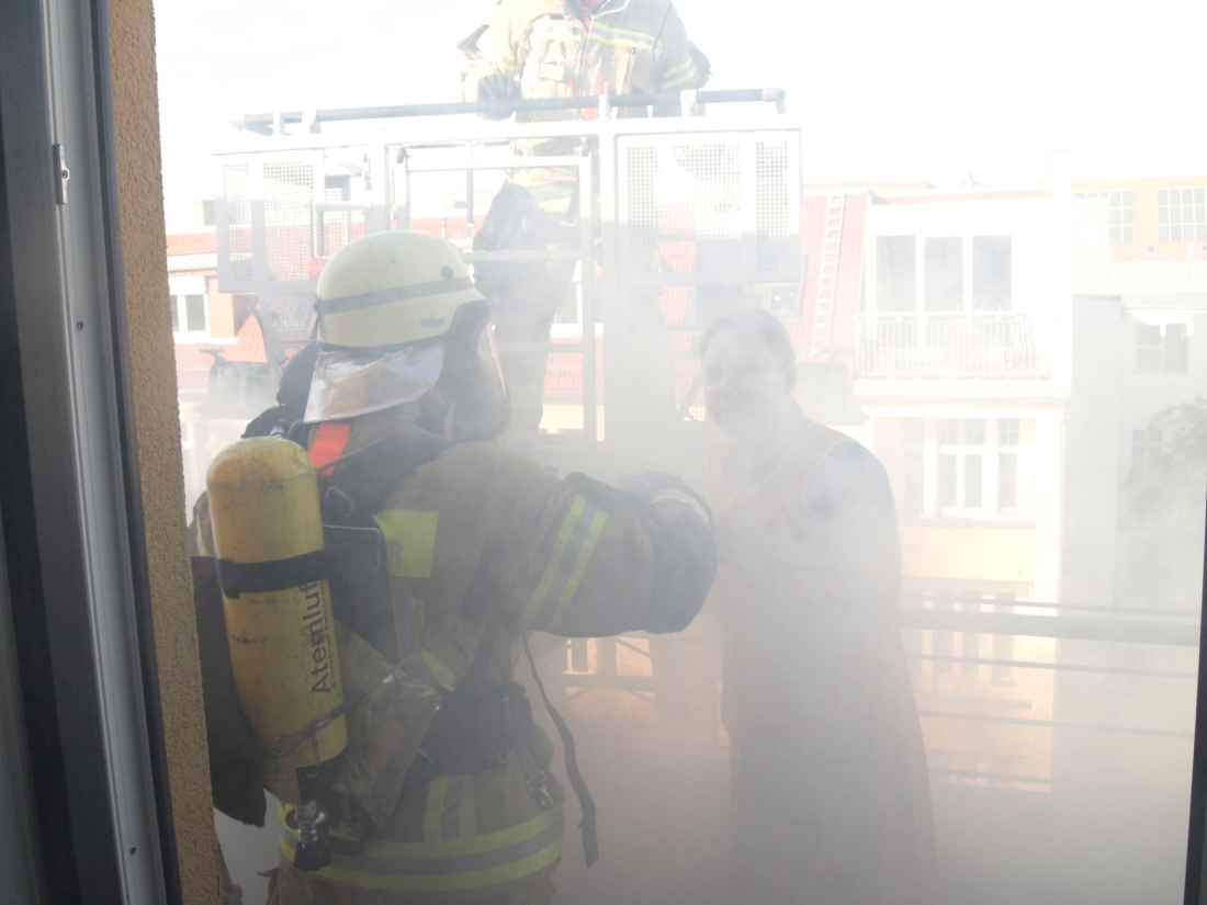 haus den Weg nach oben bahnt, bringen ihre Kameraden die große Drehleiter in Position. Ein Feuerwehrmann steigt in den am Ender der Leiter befindlichen Liftkorb, dann drückt die Hydraulik die Leiter samt Korb in die Höhe.