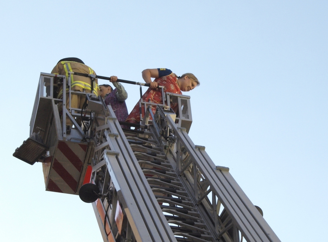 haus den Weg nach oben bahnt, bringen ihre Kameraden die große Drehleiter in Position. Ein Feuerwehrmann steigt in den am Ender der Leiter befindlichen Liftkorb, dann drückt die Hydraulik die Leiter samt Korb in die Höhe.