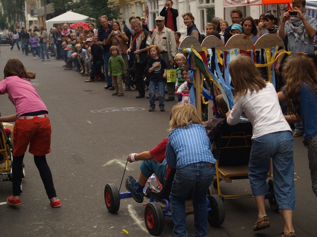Das Seifenkistenrennen war nur ein Programmpunkt beim diesjährigen Fest in der Choriner Straße. Schokokusswerfen war ebenso dabei wie eine kleine Wasserschlacht, Puppen-