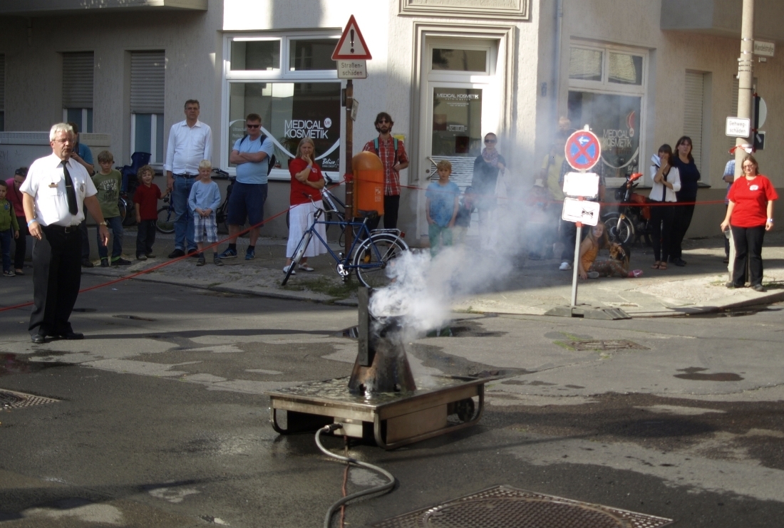 Auch die Jungs von der Jugendfeuerwehr zeigten etwas von dem, was sie bei den Kameraden in der Schieritzstraße so gelernt haben: Ein brennender Müllcontainer wurde im Handumdrehen gelöscht.