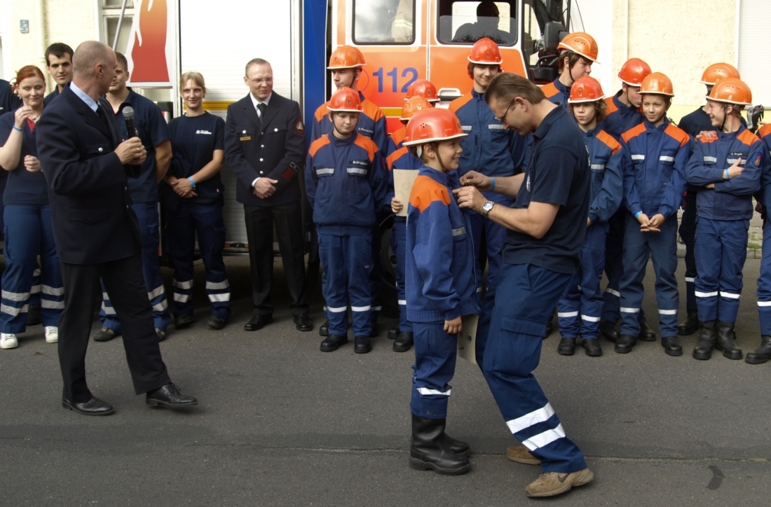 flamme Stufe 1“ an die Brust geheftet – als Zeichen dafür, dass sie die erste Prüfung ihres Feuerwehrlebens bestanden haben.