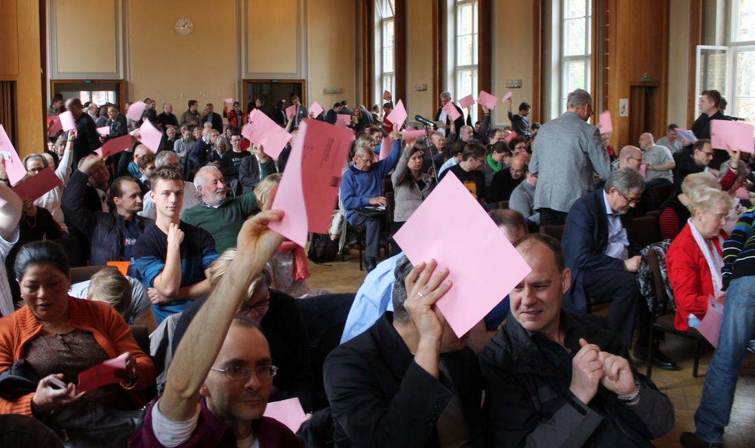 Über 230 Pankower SPD-Mitglieder waren in den BVV-Saal an der Fröbelstraße gekommen, um an der Abstimmung über den den Vorsitz ihrer Kreisorganisation teilzunehmen.