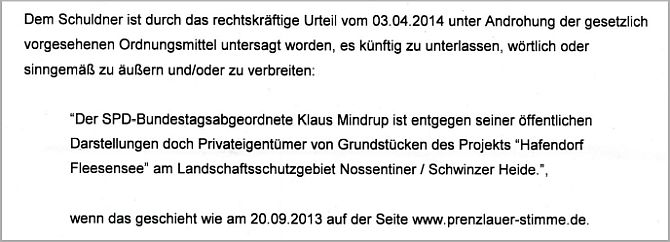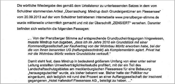 Dass sich Mindrup seinerzeit nicht auch gegen diese Passagen gewandt hatte ist nachvollziehbar: Handelt es sich dabei doch zum einen um ein Originalzitat aus seiner Mail, die er mir unter der Überschrift „Ihre Fragen zum Projekt Fleeesensee“ übersandte sowie die einzig logische Schlussfolgerung aus dieser Nachricht.